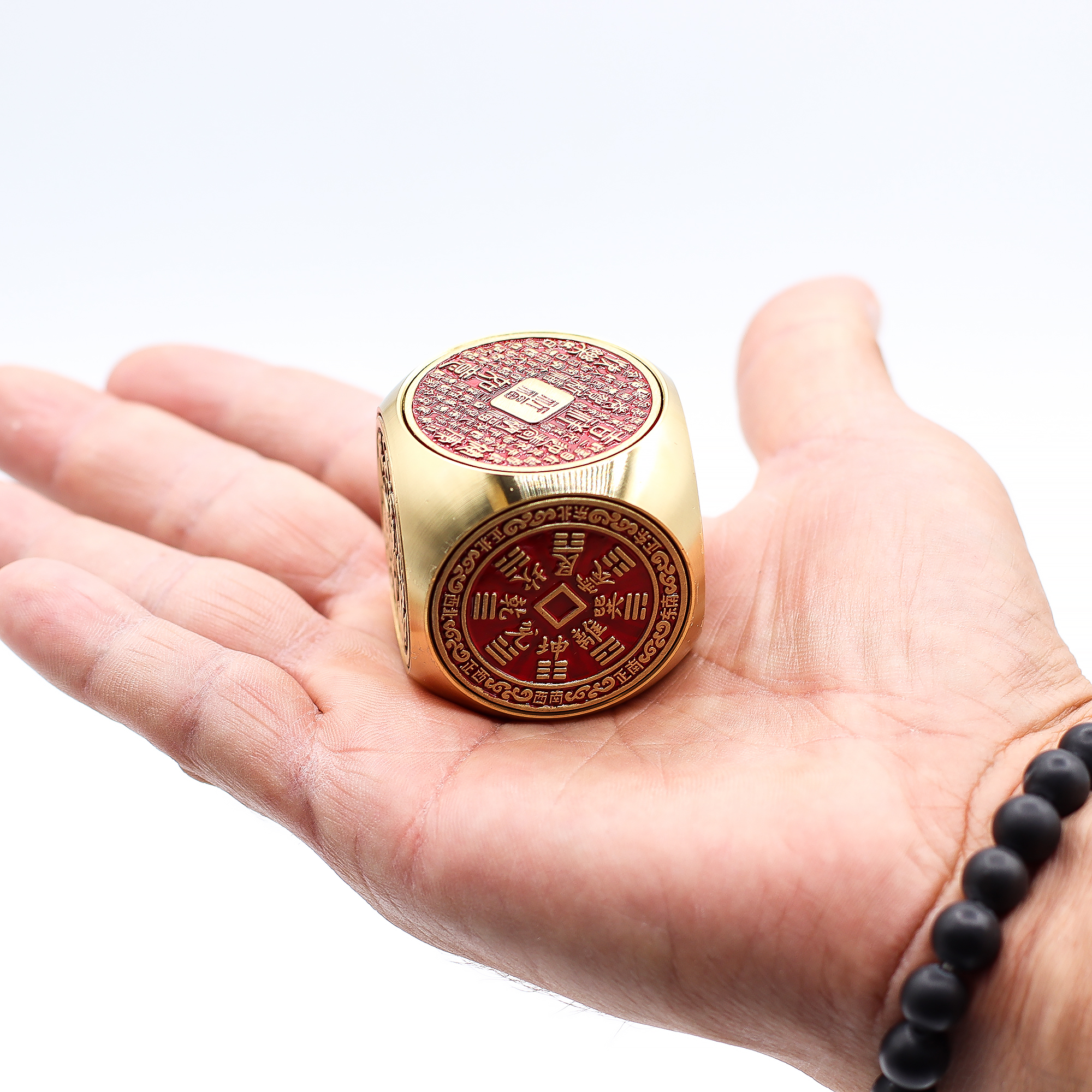 Feng Shui Šťastie – Červeno-mosadzná kocka prosperity – Plochá je precízne vyrobený dekoratívny predmet, ktorý spája tradičnú symboliku Feng Shui s elegantným dizajnom. Zhotovená z kvalitnej mosadze s výraznými červenými prvkami predstavuje bohatstvo, úspech a plynutie pozitívnej energie.