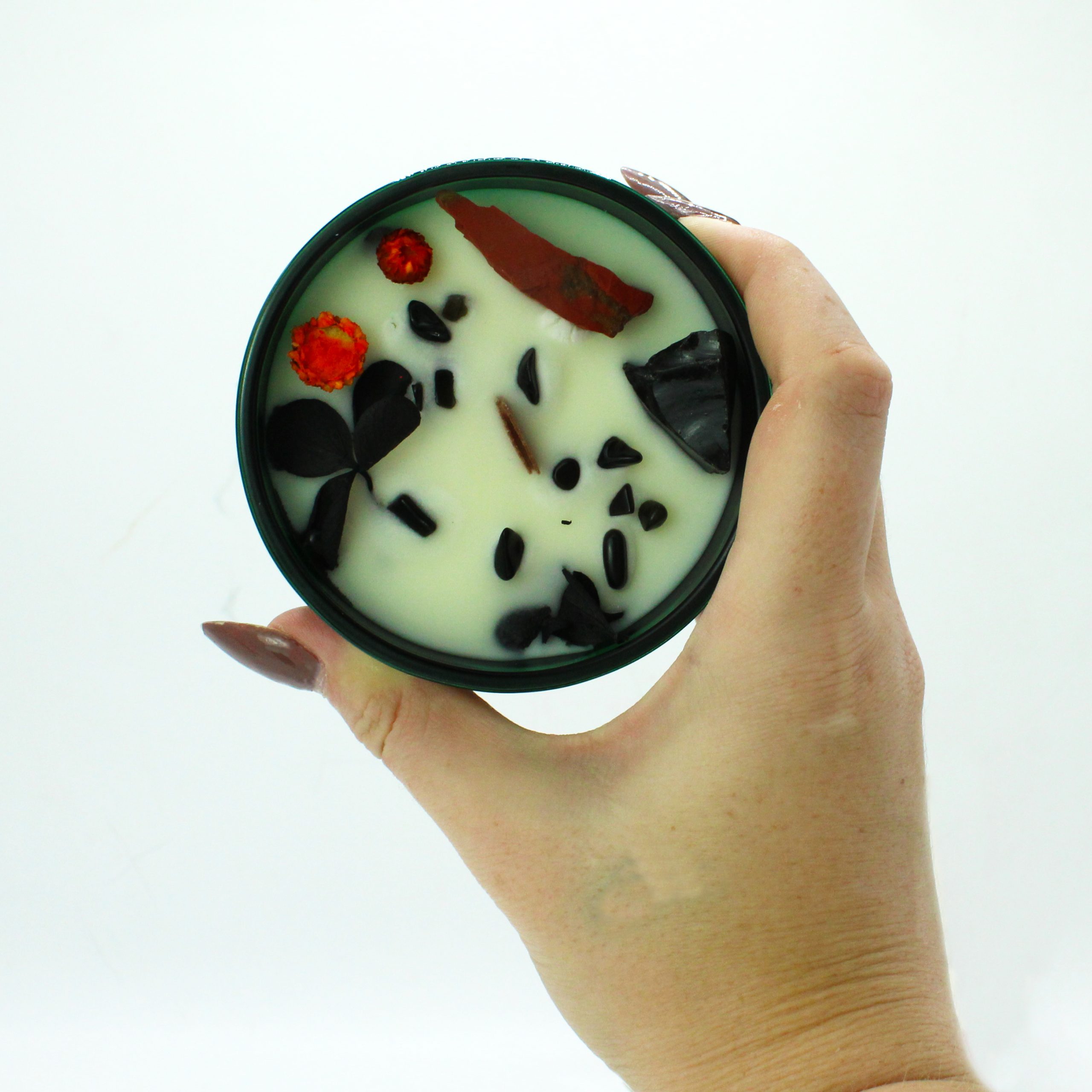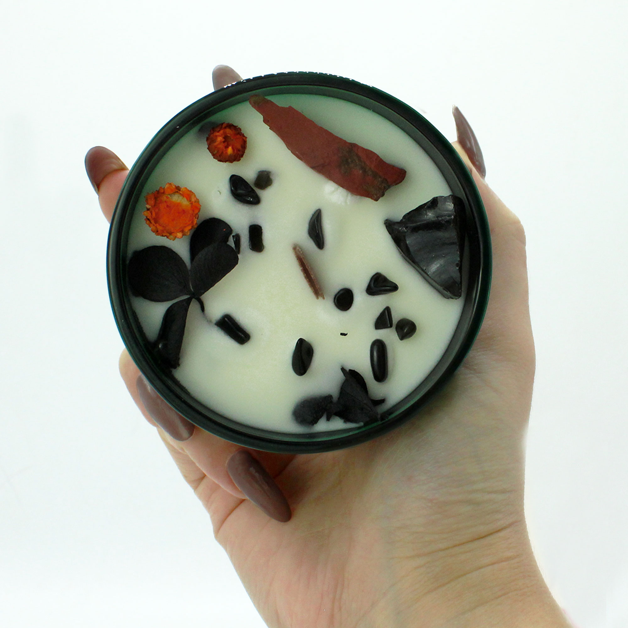 Táto sviečka obsahuje výrazný červený jaspis a drahé kamene čierneho achátu, ktoré stelesňujú ohnivú energiu vášne. Červený jaspis, známy svojimi uzemňovacími vlastnosťami, sa spája s ochrannou energiou čierneho achátu a vytvára dynamickú a posilňujúcu atmosféru. Zapáľte diabla a prijmite vášnivú intenzitu, ktorú prináša, premeňte svoj priestor na útočisko pre motiváciu a živosť.