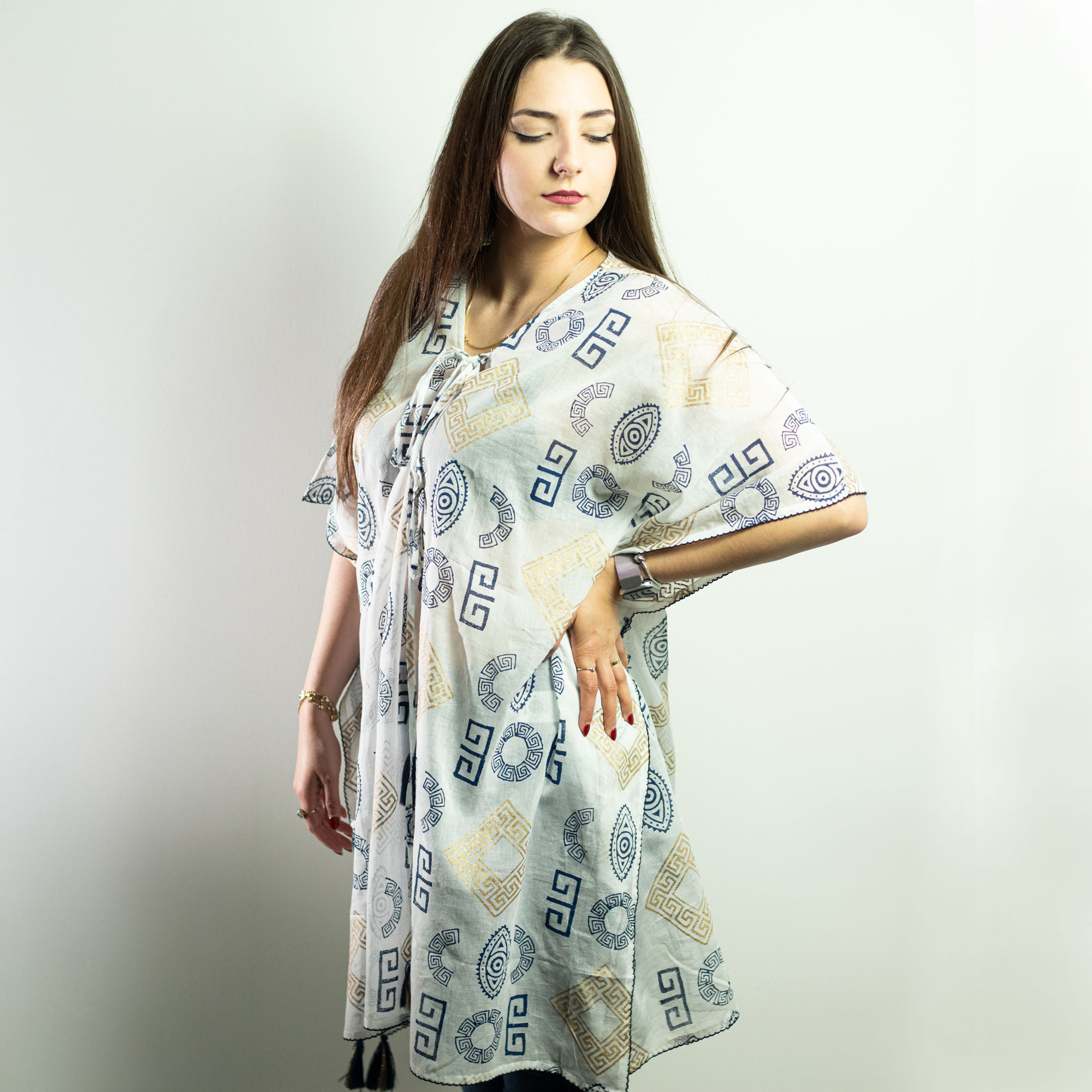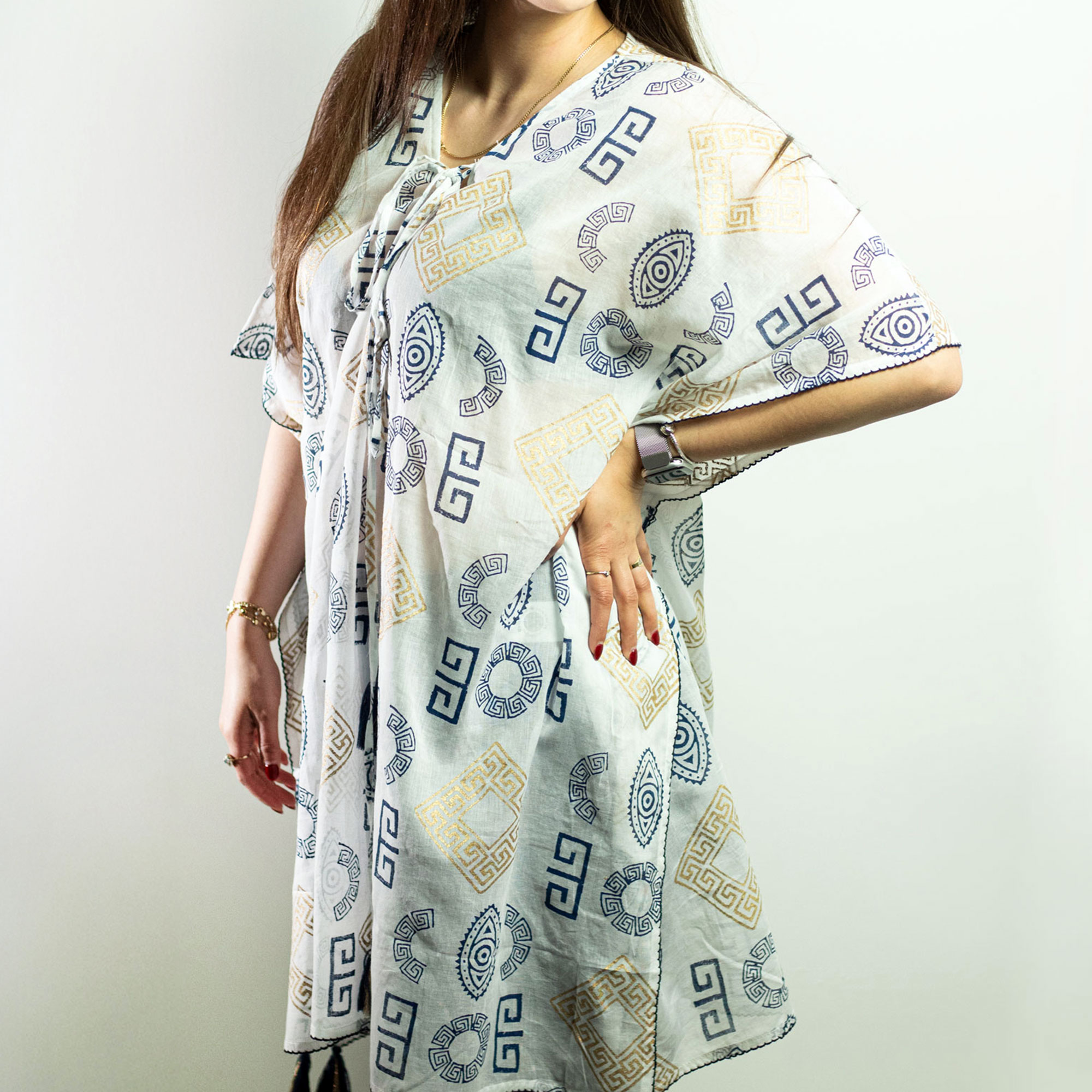 Nomád Sari – Kaftan – Zlatý a Modrý Grécky Motív – Ručne Maľovaný