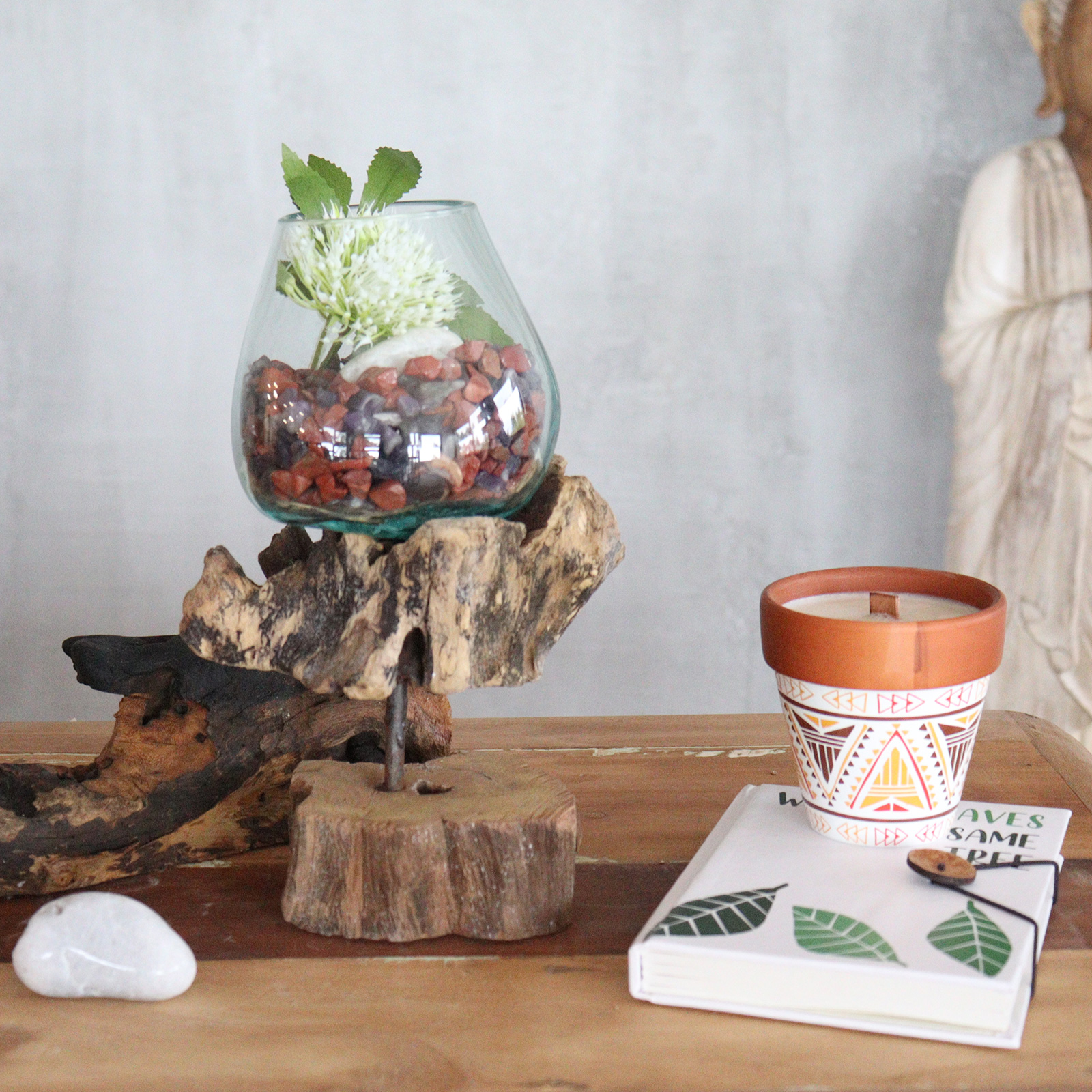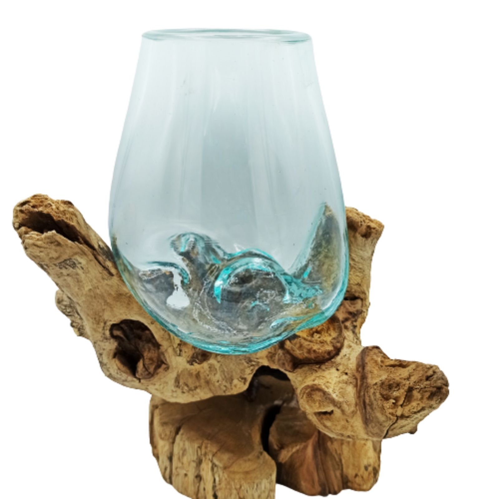 Veľkoobchodné Roztavené Sklenené Nádoby na Dreve sú nový hit, ktorý k nám prichádza z Bali. Ručne vyrábané fúkaním z recyklovaného skla a koreňov z dreva Gamal. Ešte horúce sklo sa umiestni na výrez koreňa a nechá sa zatvrdnúť do tvaru dreva čím sa zaistí jeho dokonalé uchytenie. Každý z týchto výrobkov je jedinečný.