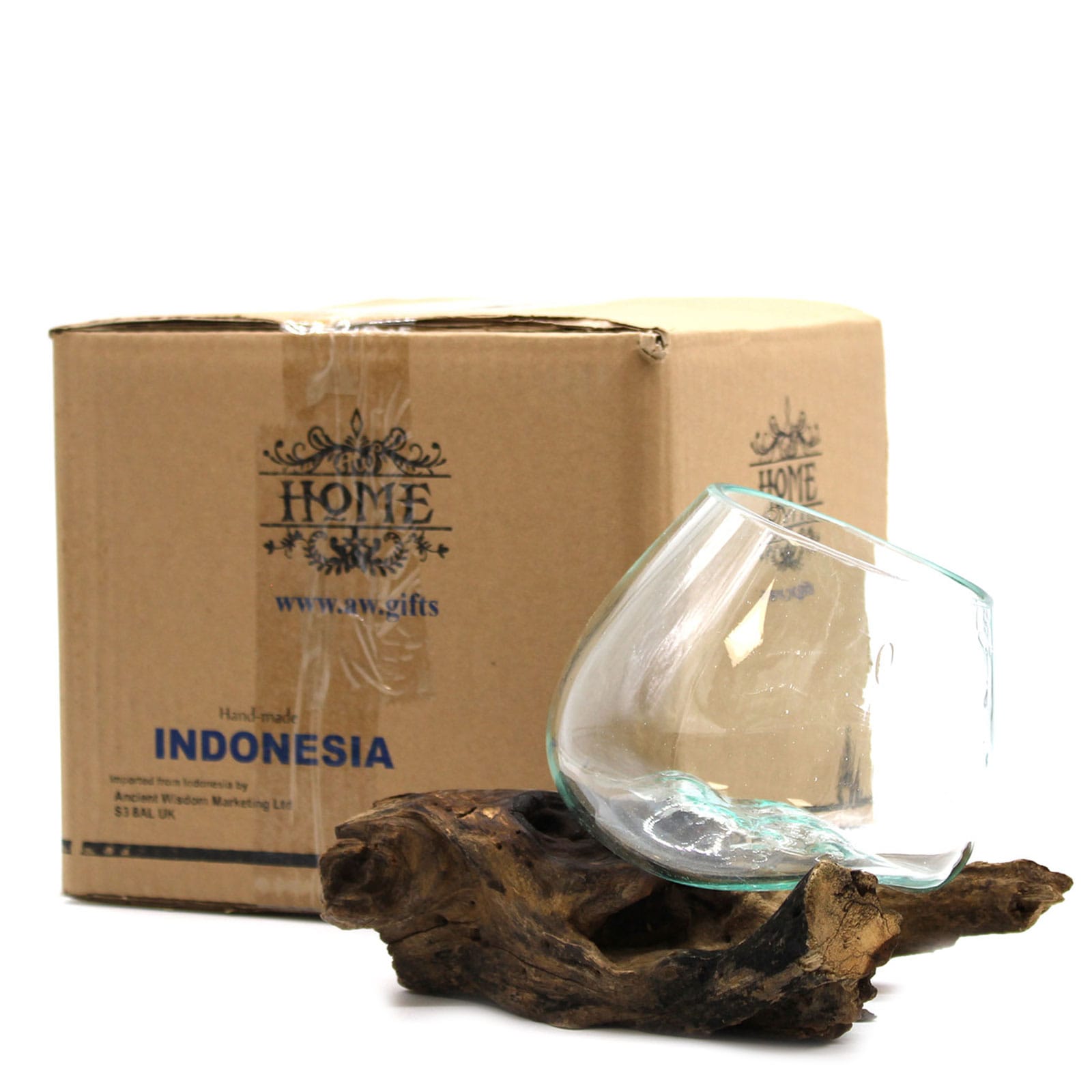 Veľkoobchodné Roztavené Sklenené Nádoby na Dreve – Stredná Misa sú nový hit, ktorý k nám prichádza z Bali. Ručne vyrábané fúkaním z recyklovaného skla a koreňov z dreva Gamal. Ešte horúce sklo sa umiestni na výrez koreňa a nechá sa zatvrdnúť do tvaru dreva čím sa zaistí jeho dokonalé uchytenie. Každý z týchto výrobkov je jedinečný.
