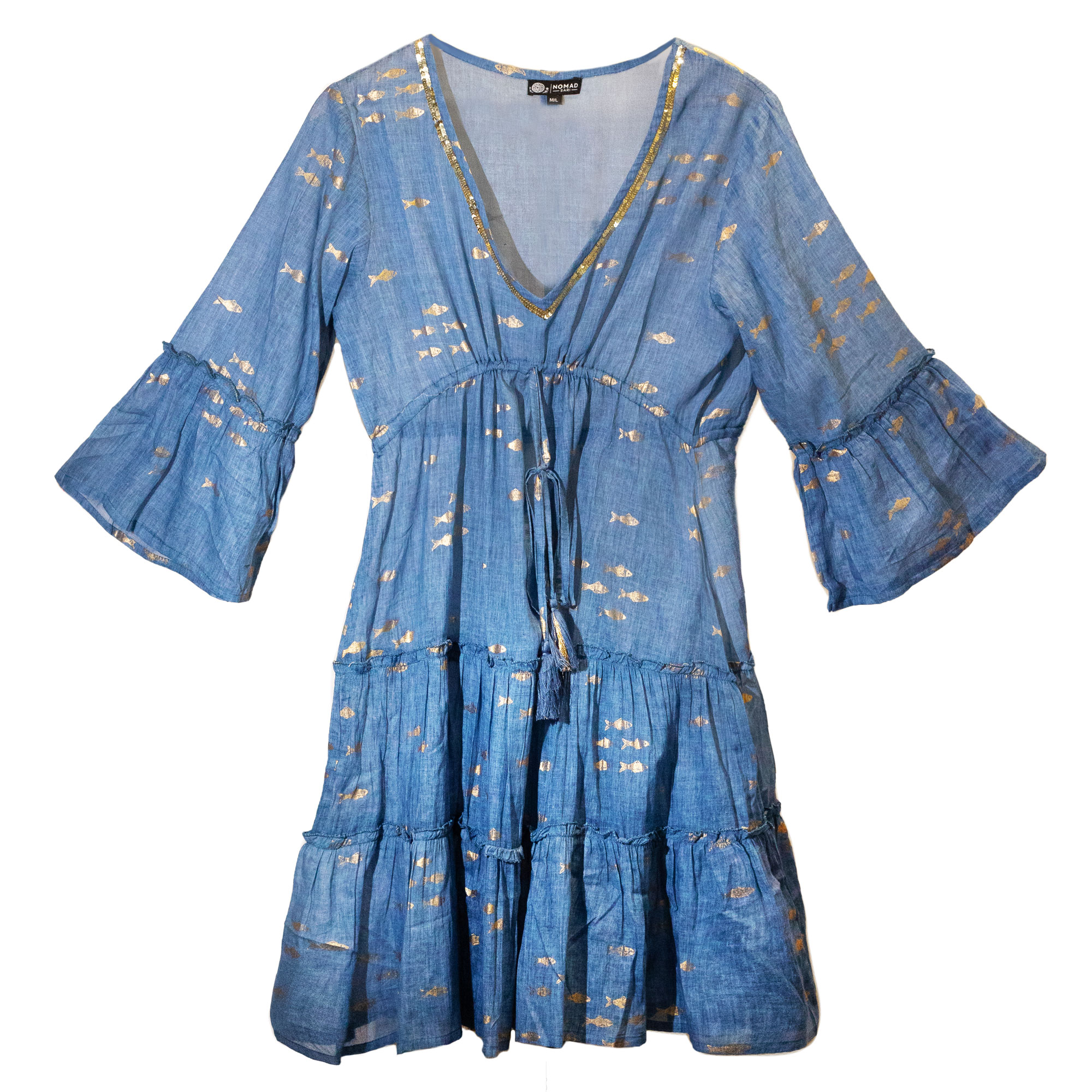 množstvo Ručne Maľované Šaty Nomad Sari s Morskou Modrou a Zlatou Rybkou M/L