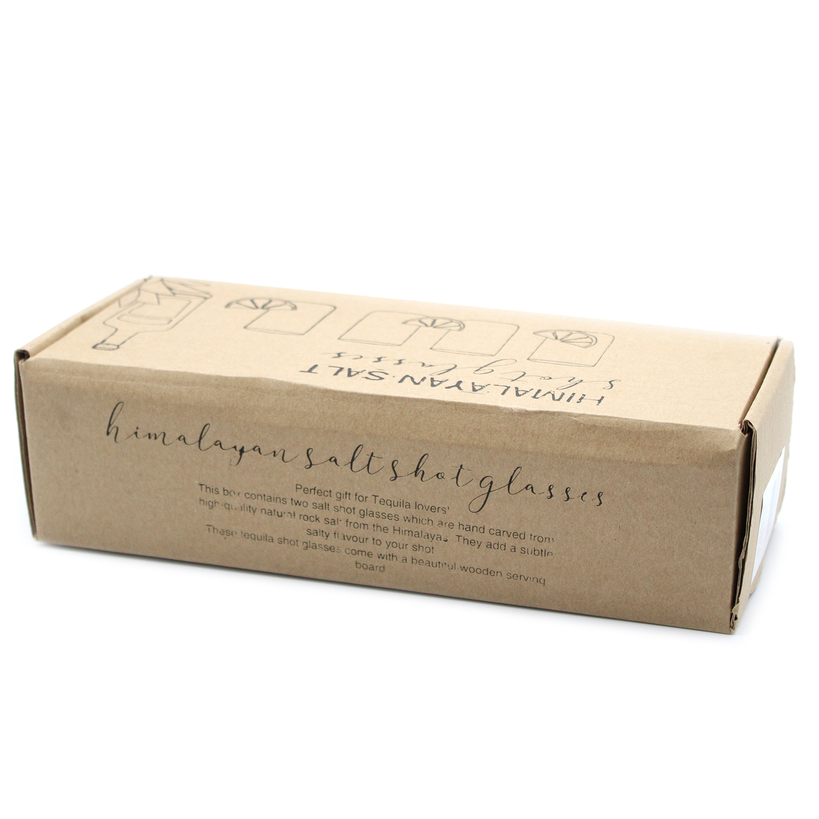 Veľkoobchodná Sada 4 Himalájskych Soľných Pohárov sa predáva so Servírovacím Podnosom z prírodného vyrezávaného dreva v darčekovej krabičke.