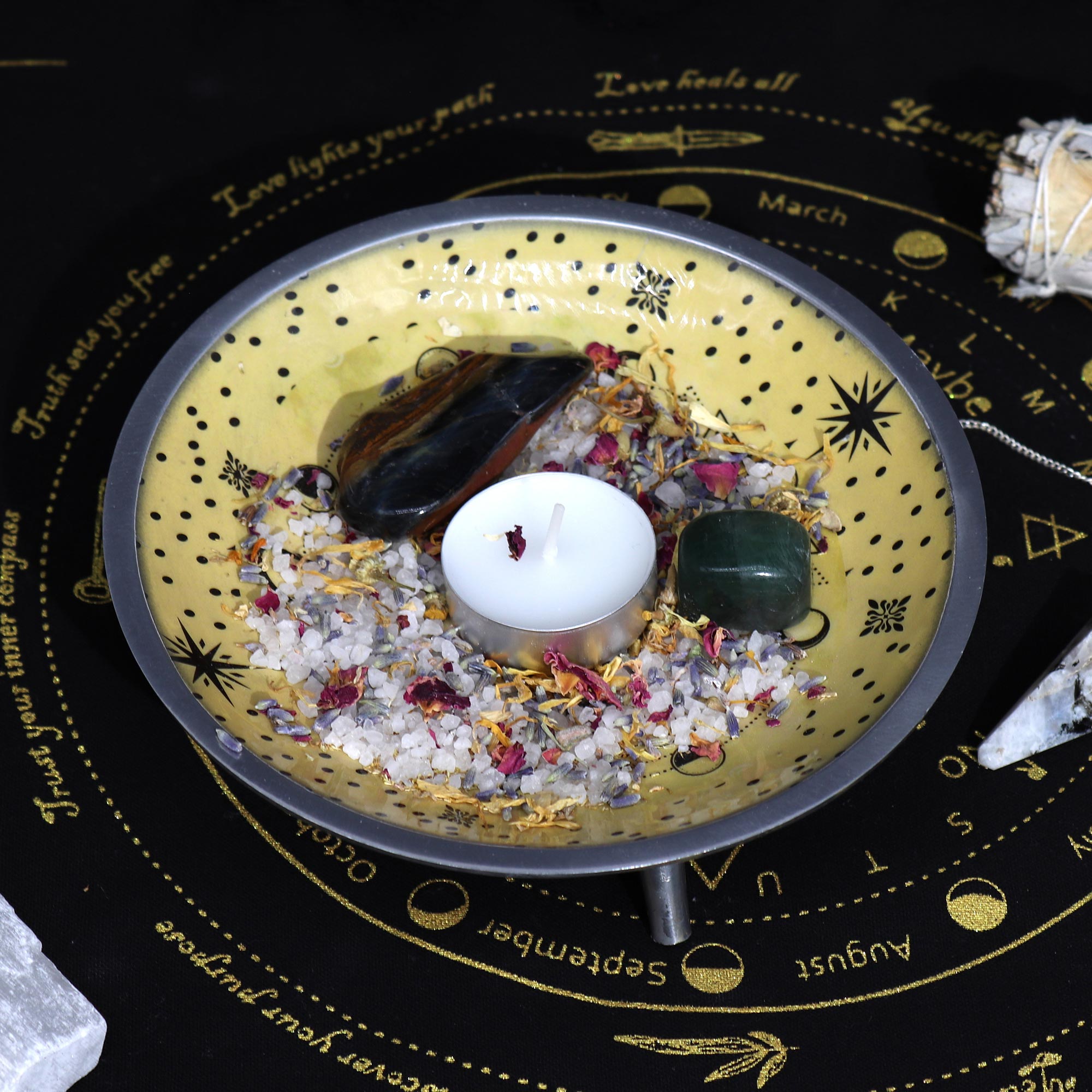 Smaltovaný Obetný Tanier s Tromi Nožičkami – Ruky a Slnko