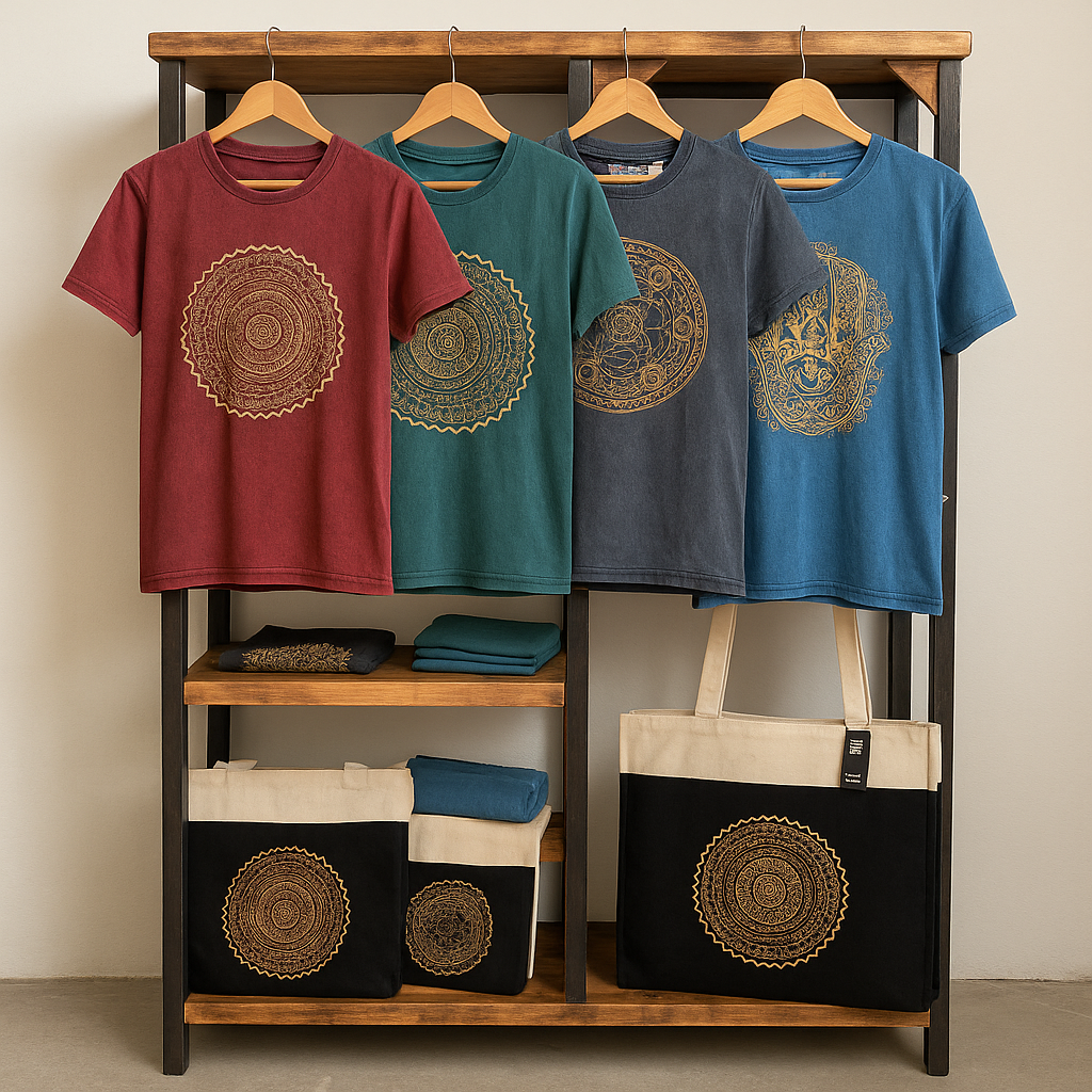 ? Tip: Vystavte tričká spolu so zladenými taškami a vytvorte vizuálne zladený kútik s remeselnou atmosférou. Set je ideálny pre boho butiky, festivalové stánky, ekoshopy alebo predajne s udržateľnou módou.
