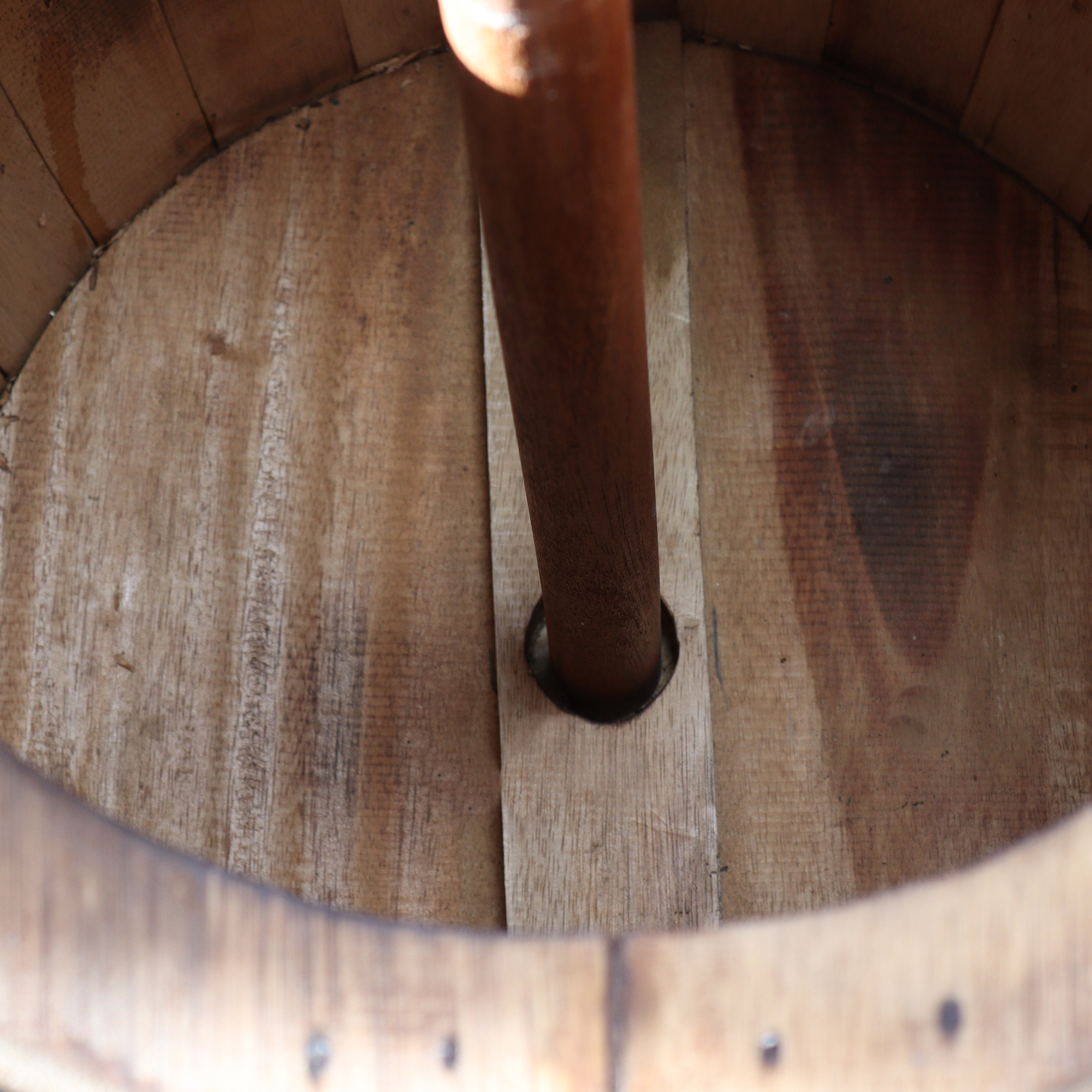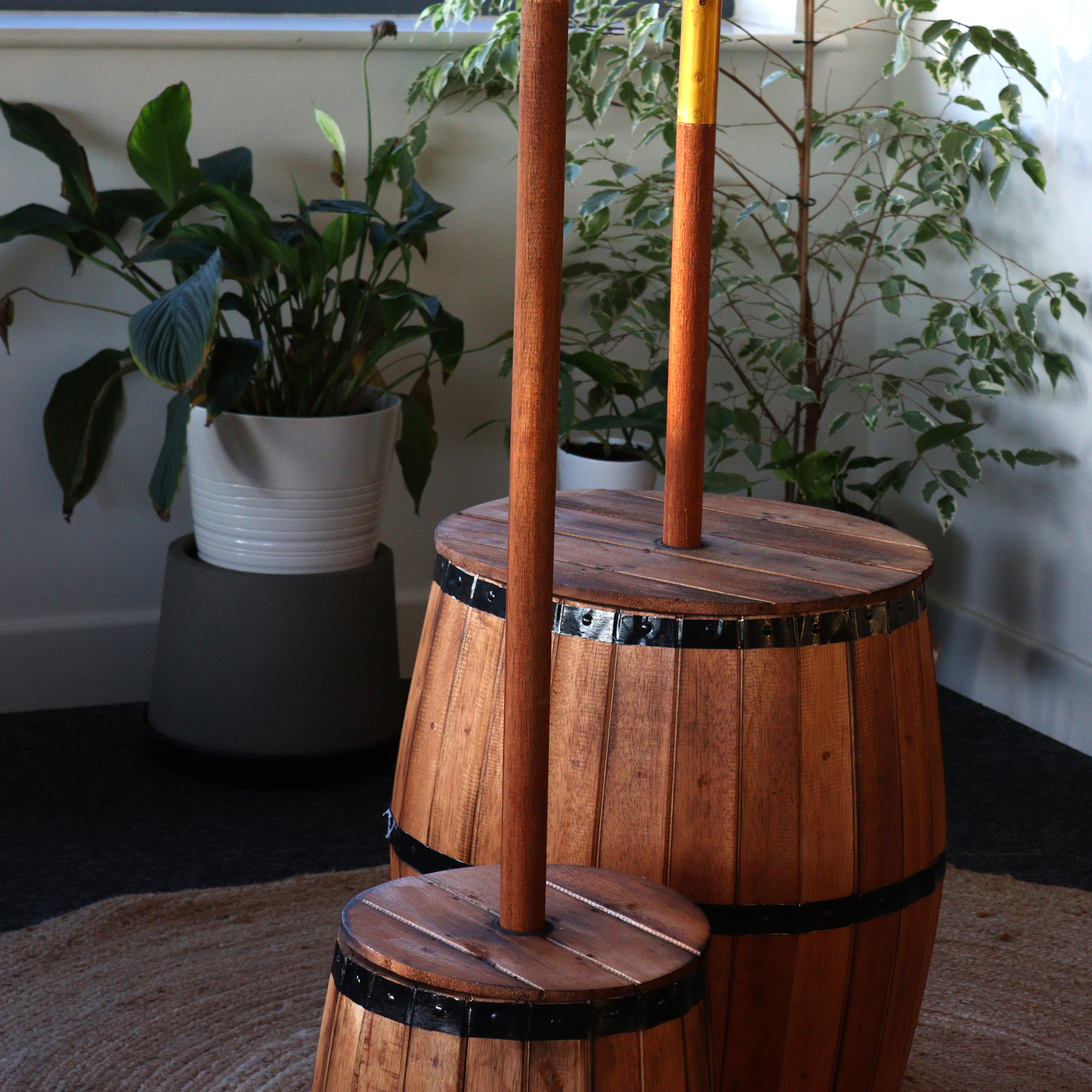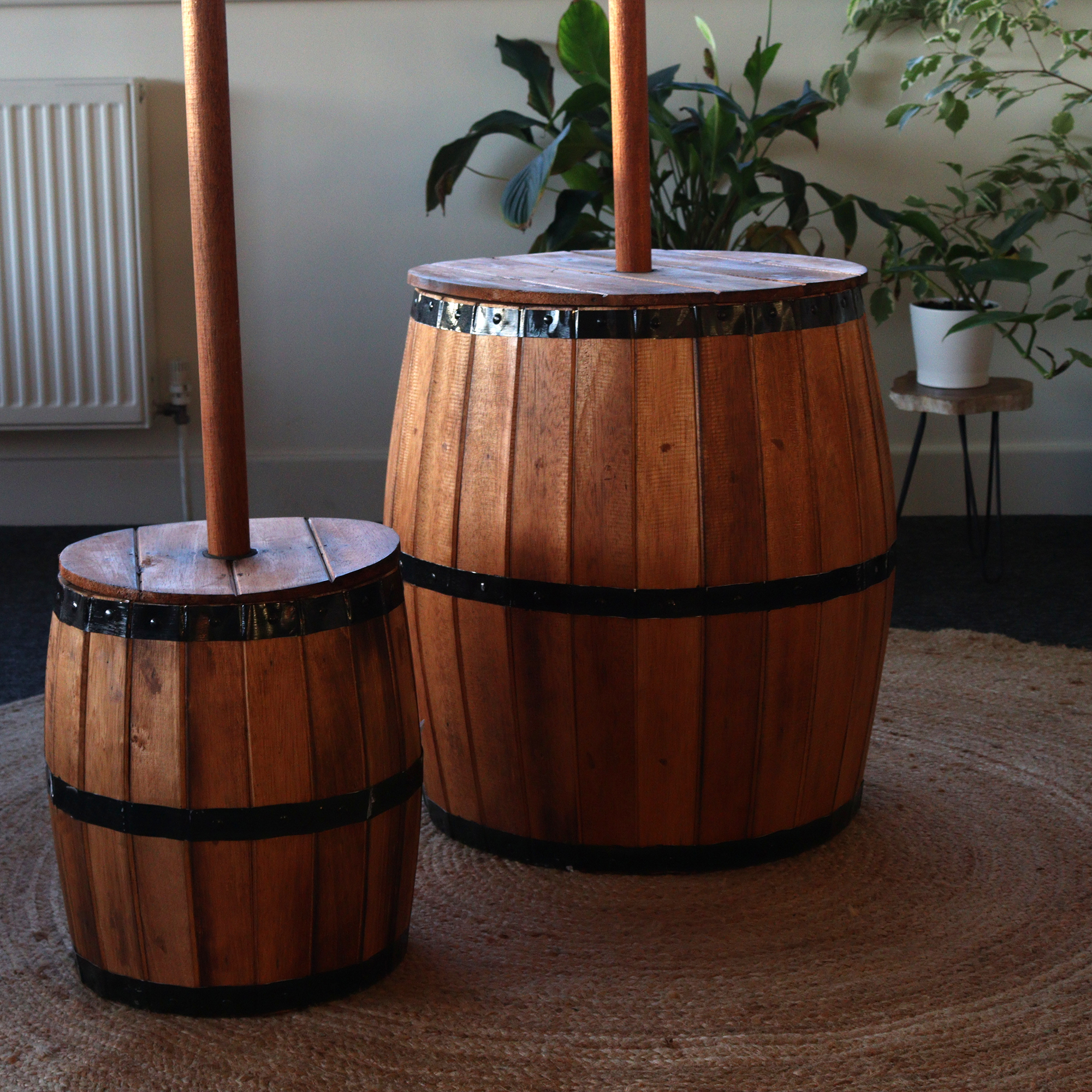 Tento robustný a štýlový sud je vyrobený z prírodného dreva a funguje ako pevný stôl a praktická základňa slnečníka.